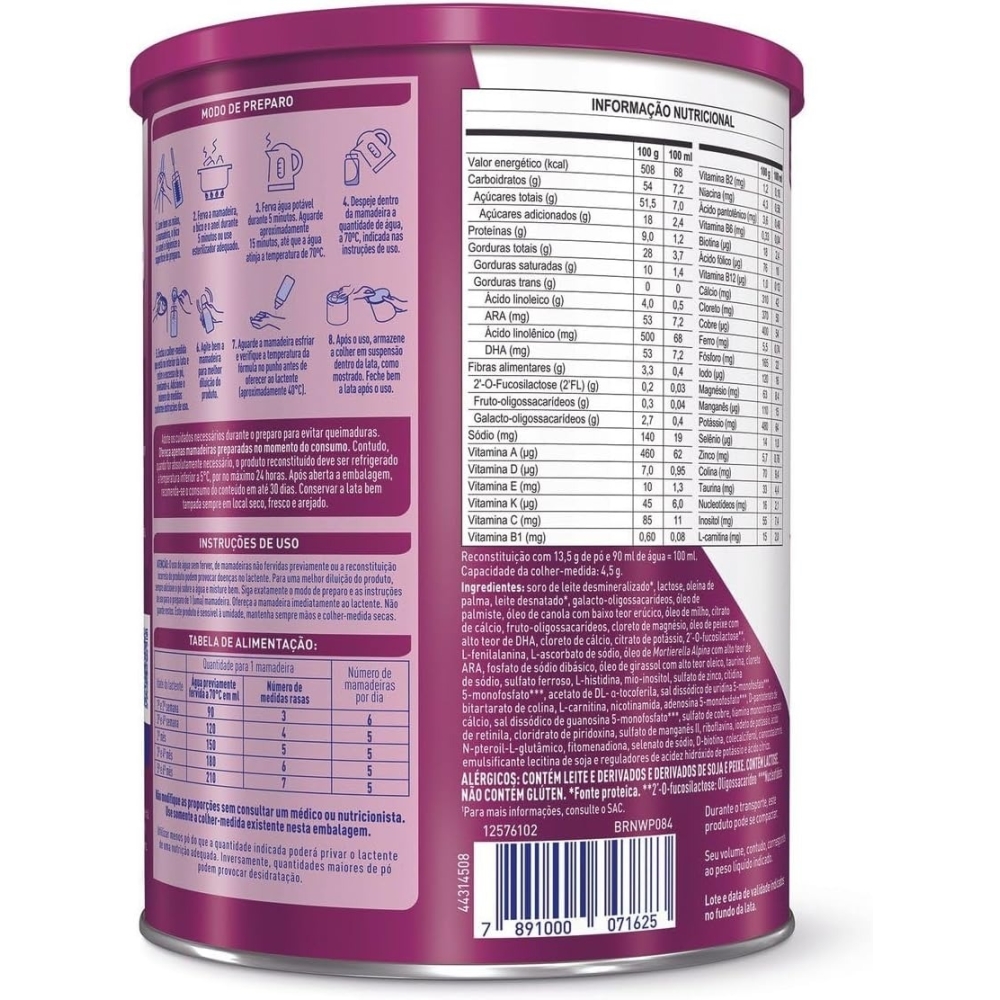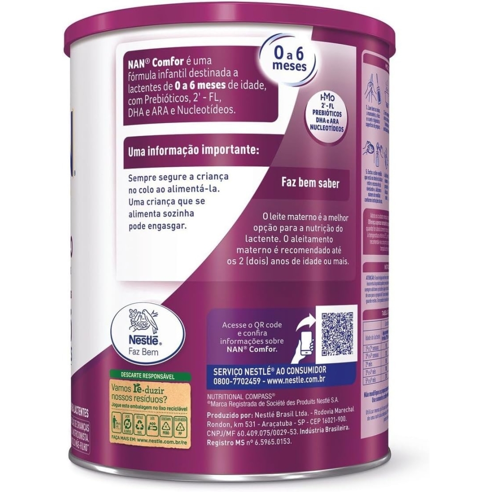 Fórmula Infantil Comfor 1 Lata 400g NanDESCRIÇÃO:O NAN Comfor 1 é uma fórmula infantil para lactentes, desenvolvido pela Nestlé, que contém prebióticos, DHA, ARA e Nucleotídeos. Apresenta baixo teor de sódio, além de ser sem açúcar, glúten e aromatizantes.Seu uso é indicado para suprir as necessidades nutricionais de lactentes de 0 a 6 meses. Possui um mix de gorduras que inclui os ácidos graxos essenciais, além de vitaminas e minerais.ESPECIFICAÇÕES:Fabricante: NestléMarca: NanTipo: Fórmula Infantil Comfor 1Indicação (idade): 0 a 6 mesesConteúdo (lata): 400gBENEFÍCIOS:Contém prebióticos, DHA, ARA e nucleotídeosIndicado para suprir as necessidades nutricionaisINGREDIENTES:Soro de leite desmineralizado, lactose, oleína de palma, leite desnatado, galacto-oligossacarídeos, óleo de palmiste, óleo de canola com baixo teor erúcico, óleo de milho, minerais (citrato de cálcio, cloreto de magnésio, cloreto de cálcio, citrato de potássio, fosfato de sódio dibásico, cloreto de sódio, sulfato ferroso, sulfato de zinco, sulfato de cobre, sulfato de manganês, iodeto de potássio e selenato de sódio), fruto-oligossacarídeos, óleo de peixe, L-fenilalanina, vitaminas (L-ascorbato de sódio, mio-inositol, acetato de DL-a-tocoferila, bitartarato de colina, nicotinamida, D-pantotenato de cálcio, tiamina mononitrato, acetato de retinila, cloridrato de piridoxina, riboflavina, ácido N-pteroil-L-glutâmico, filoquinona, D-biotina, colecalciferol e cianocobalamina), óleo de Mortierella alpina, óleo de girassol, nucleotídeos (maltodextrina, citidina 5-monofosfato, sal dissódico de uridina 5-monofosfato, adenosina 5-monofosfato, sal dissódico de guanosina 5-monofosfato), taurina, L-histidina, L-carnitina, emulsificante lecitina de soja, reguladores de acidez hidróxido de potássio e ácido cítrico.MODO DE PREPARO:1 e 2: Lave bem as mãos, a mamadeira, o bico e o anel e higienize a superfície de preparo. 3: Ferva a mamadeira, o bico e o anel durante 5 minutos ou use esterilizador adequado. 4: Ferva água potável durante 5 minutos. Aguarde aproximadamente 15 minutos, até que a água atinja a temperatura de 70ºC. 5: Despeje na mamadeira a quantidade de água, previamente fervida, indicada nas instruções de uso. 6: Encha a colher medida que está no interior da lata e retire o excesso de pó, nivelando-a. 7: Adicione o número de medidas conforme instruções de uso. 8: Agite bem a mamadeira para melhor diluição do produto. 9: Aguarde a mamadeira esfriar e verifique a temperatura da fórmula no punho antes de oferecer ao lactente, (aproximadamente 40ºC). 10 e 11: Após o uso, armazene a colher em suspensão dentro da lata. Feche bem a lata após o uso.ATENÇÃO:*Contém lactose*Não contém glúten*Este produto não é leite em pó.*Contém derivados de leite, soja e peixe.*Guarde a lata bem tampada em lugar fresco e seco.*O aleitamento materno evita infecções e alergias e fortalece o vínculo mãe-filho.*Este produto é sensível à umidade, mantenha sempre as mãos e a colher de medidas secas.*Após aberta a lata, o produto conserva-se indicado para o consumo até o prazo máximo de 30 dias.*Este produto somente deve ser usado na alimentação de crianças menores de 1 (um) ano de idade com indicação expressa de médico ou nutricionista.