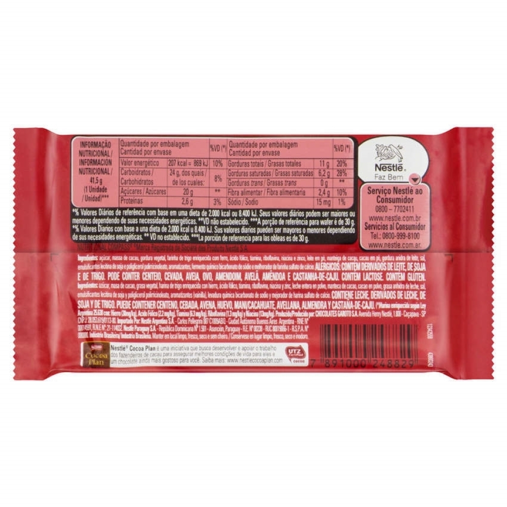 Açúcar, massa de cacau, gordura vegetal, farinha de trigo enriquecida com ferro, ácido fólico, tiamina, riboflavina, niacina e zinco, leite em pó, manteiga de cacau, cacau em pó, gordura anidra de leite, sal, emulsificantes lecitina de soja e poliglicerol polirricinoleato, aromatizantes, fermento químico bicarbonato de sódio e melhorador de farinha sulfato de cálcio. ALÉRGICOS: CONTÉM DERIVADOS DE LEITE, DE SOJA E DE TRIGO. PODE CONTER CENTEIO, CEVADA, AVEIA, OVO, AMENDOIM, AVELÃ, AMÊNDOA E CASTANHA-DE-CAJU. CONTÉM LACTOSE. CONTÉM GLÚTEN.