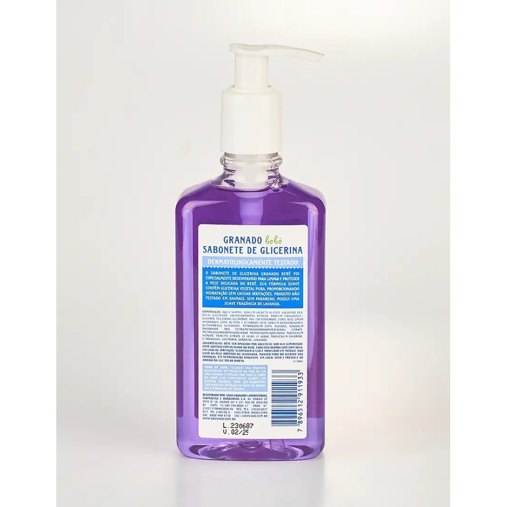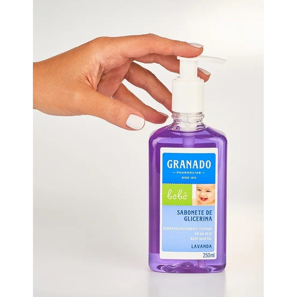 Formulado com glicerina vegetal e pH da pele, o sabonete limpa com suavidade a pele do bebê, deixando-a macia e perfumada.Embalagem prática com válvula pump e refil. Especialmente desenvolvido para a pele delicada do bebê.Dermatologicamente testado.Livre de parabenos e ingredientes de origem animal.Conteúdo: 250ml.Coloque uma pequena quantidade do produto na mão ou em uma esponja e espalhe por todo o corpo do bebê com movimentos suaves. Em seguida enxágue. Pode ser dissolvido com pequena agitação na água do banho até a formação de espuma. Mais informações FragrânciasLavanda MarcaGranado Volume250 ml