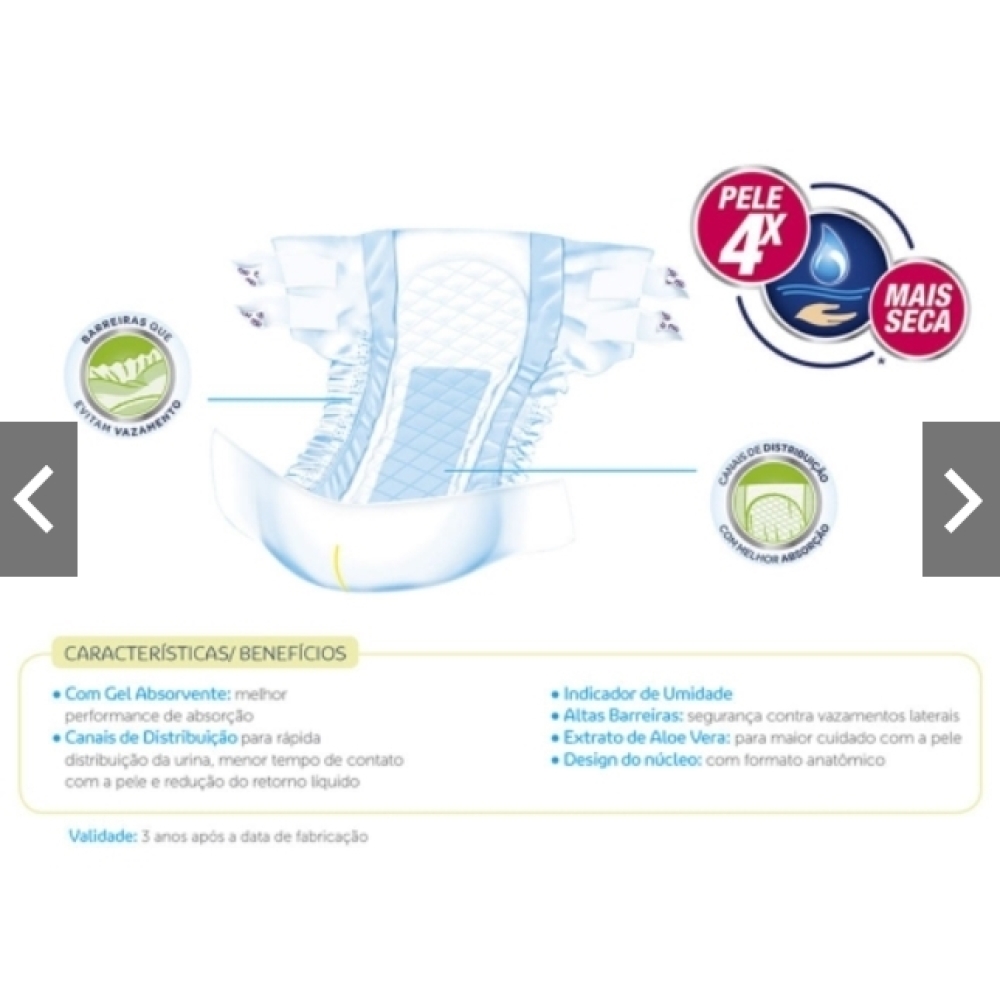 Características: barreira antivazamento para segurança máxima contra vazamento de urina. Código de cores que facilita a seleção do produto pela embalagem. Indicador de umidade para mostrar quando o produto deve ser trocado. Camada de Superabsorção que proporciona secagem excepcional, uma melhor velocidade e excelente retenção.