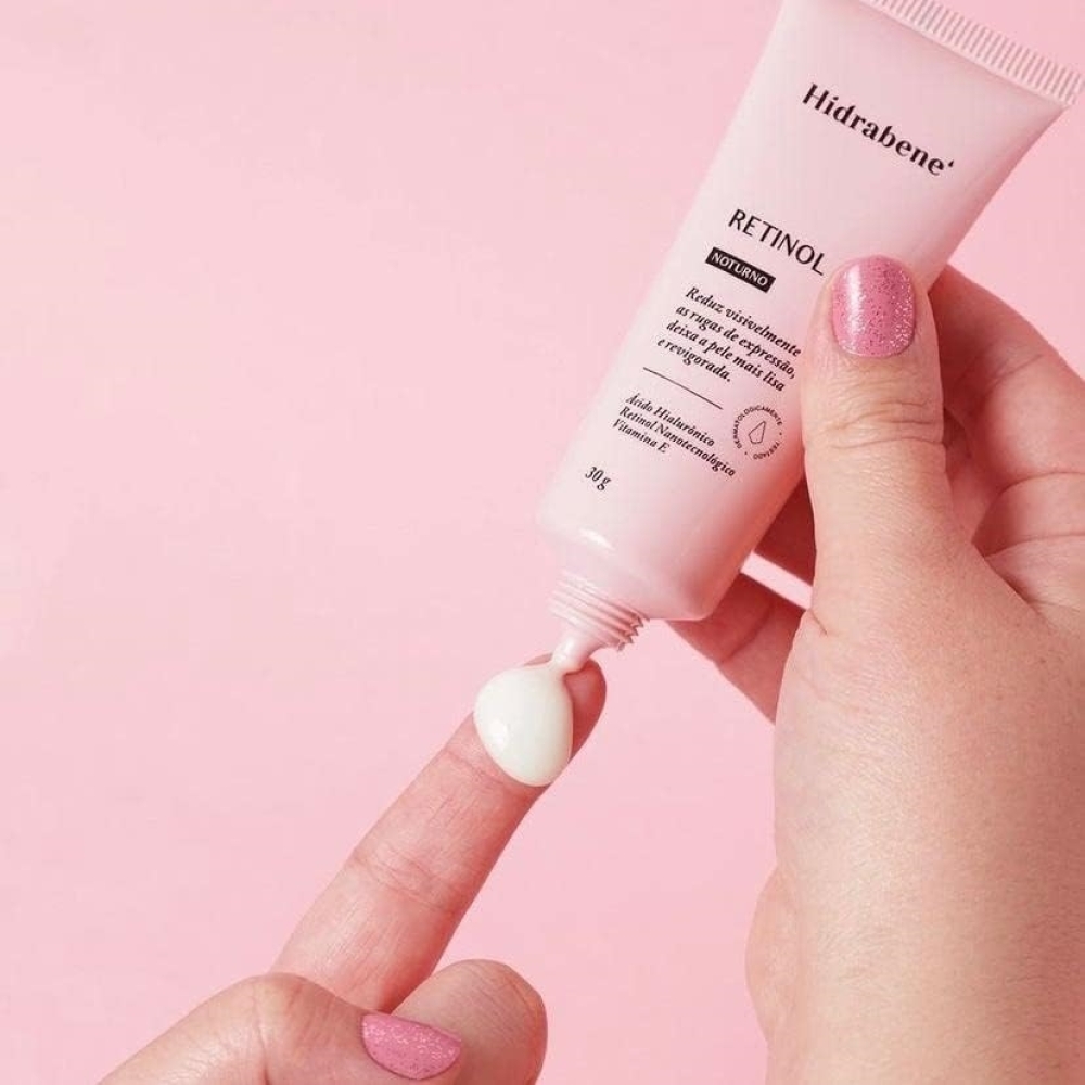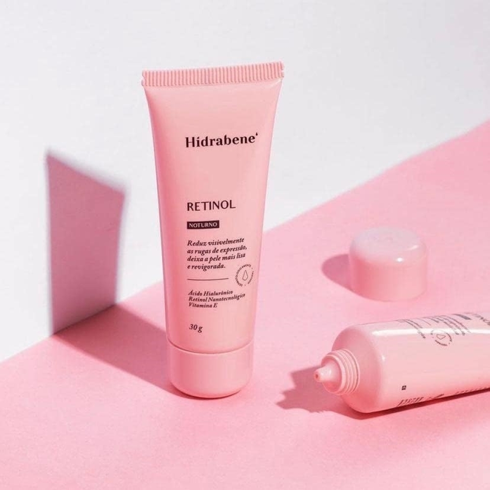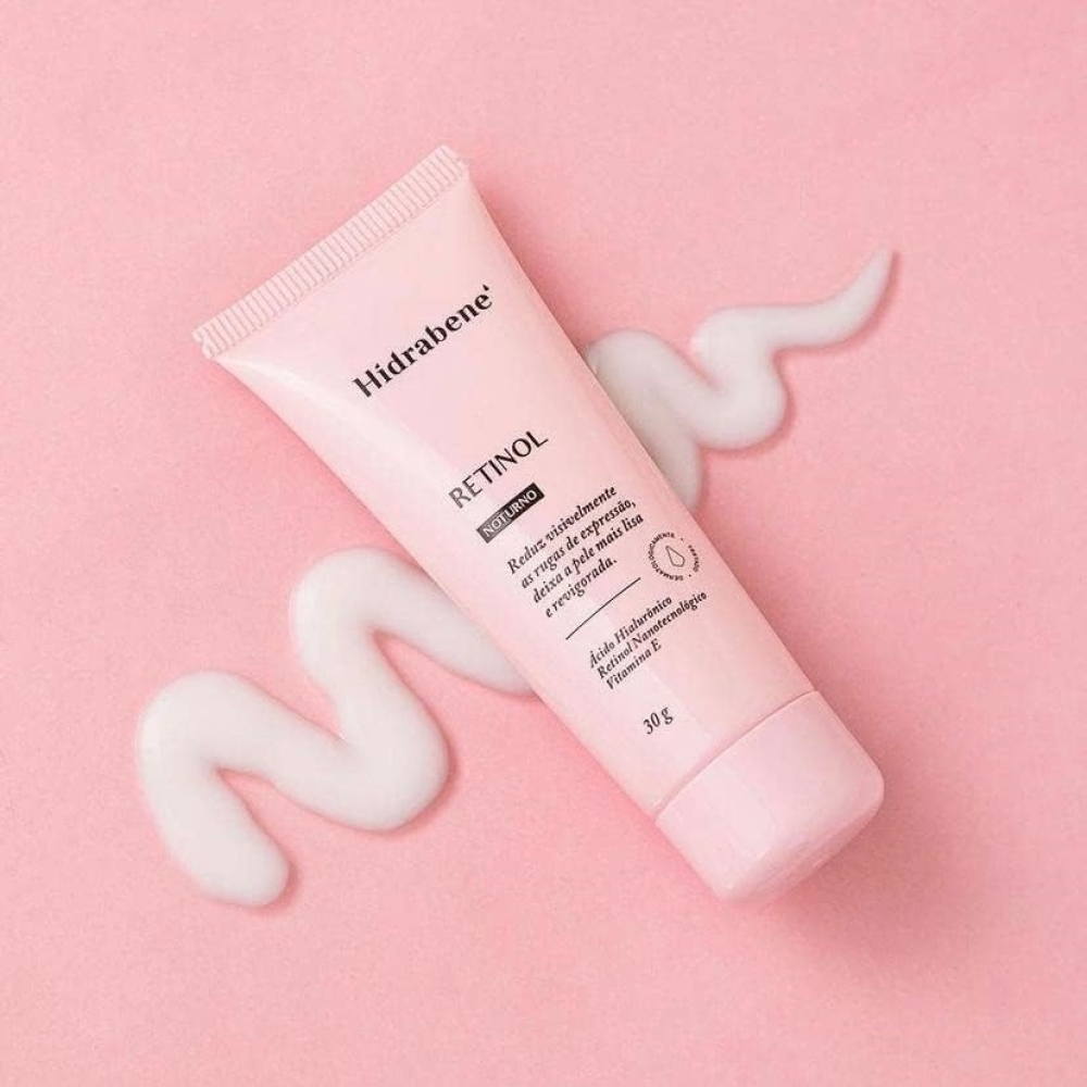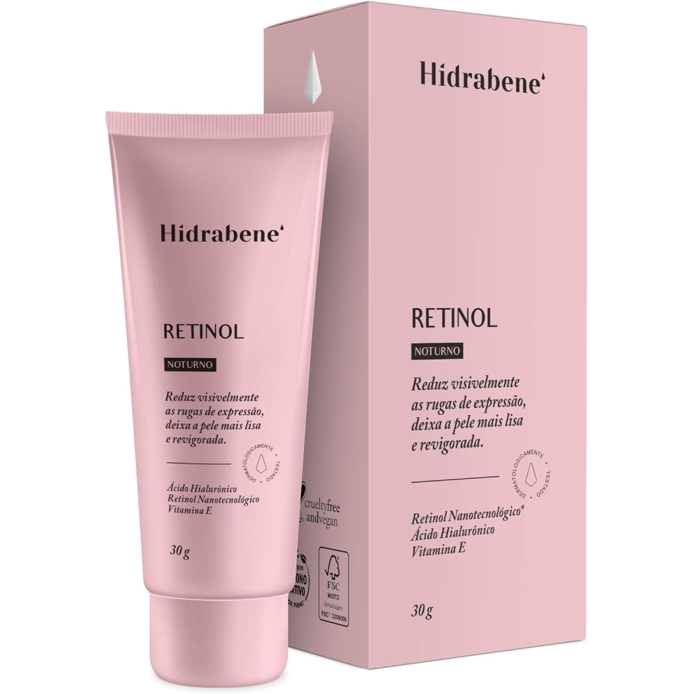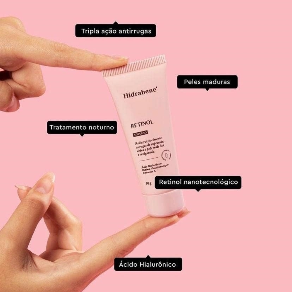 Hidrabene Retinol Noturno é um creme facial anti-idade com eficácia comprovada no combate aos sinais do envelhecimento. Formulado com Ácido Hialurônico, Retinol nanotecnológico e Vitamina E, reduz rugas e linhas de expressão, melhora a elasticidade e firmeza da pele, e a deixa mais jovem, luminosa e hidratada.Retinol age na pele de forma segura e sem agredi-la. É um produto vegano, não contém óleo (Oil Free), parabenos e nem petrolatos. Também é hipoalergênico (formulado para minimizar o possível surgimento de alergia) e não entope os poros.Indicado para todos os tipos de pele, em especial pele de pessoas acima de 35 anos de idade ou com sinais de envelhecimento. Consulte o dermatologista.