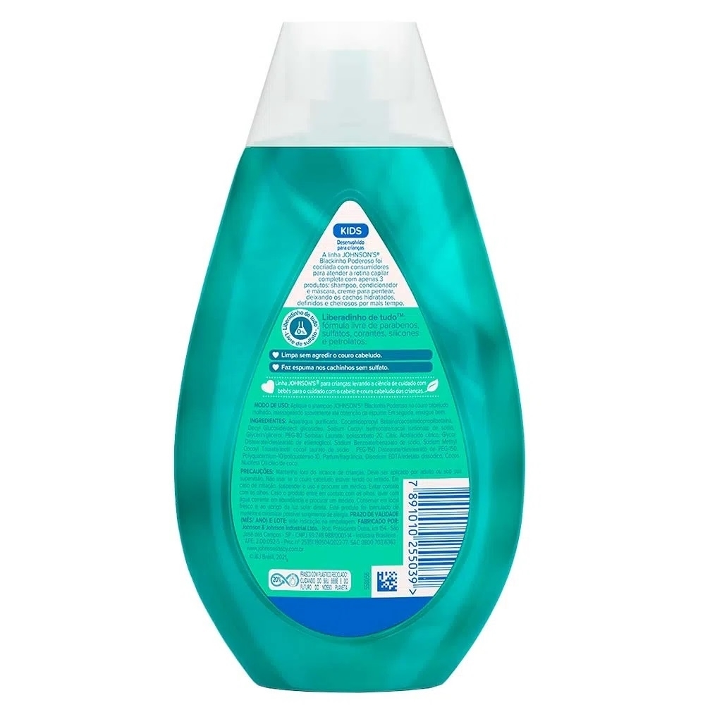 Desenvolvido especialmente para cabelos com curvatura de 3B a 4C, o Shampoo Infantil Para Cabelos Crespos Johnson’s Blackinho Poderoso, , que hidrata e desembaraça, é enriquecido com óleo de coco e Liberadinho de Tudo- livre de corantes, sulfatos, petrolatos, parabenos e silicones.