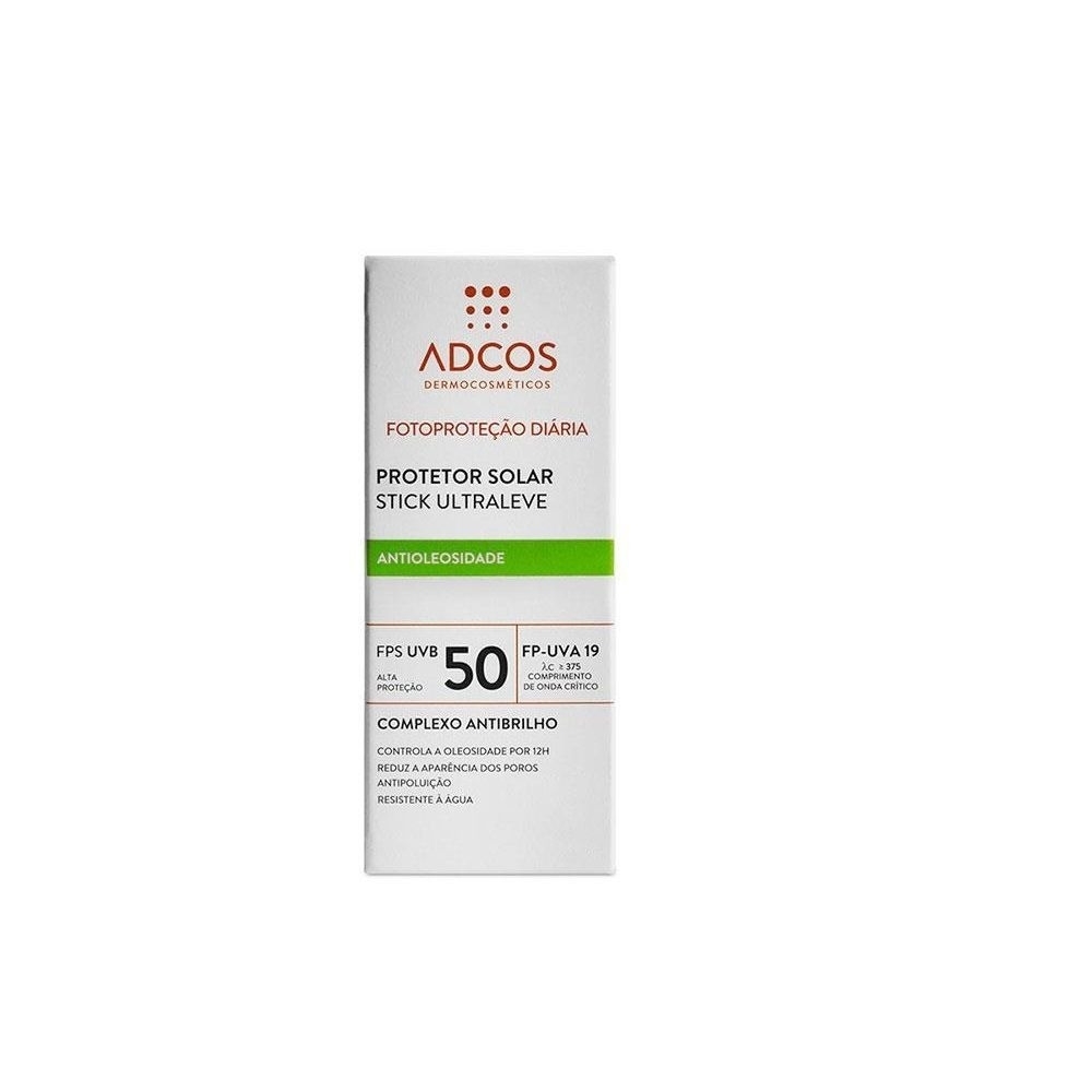 O protetor solar é o principal meio de proteção da pele contra os raios nocivos do sol e a principal forma de prevenir o câncer da pele. Para atender a diversidade da pele brasileira, o protetor solar no formato stick, que é destaque da Adcos, tem agora a versão antioleosidade com FPS 50 e com exclusiva textura ultraleve. Esse é o Protetor Solar Stick FPS 50. O complexo antibrilho é o componente de destaque desse protetor solar facial, que promove ação seborreguladora, reduz a aparência dos poros imediatamente após a aplicação e com uso prolongado. Previne acne, equilibra o microbioma da pele com sensorial macio, sedoso e aveludado sendo indicado para todos os tipos de peles, inclusive mistas e oleosas. Com tecnologia exclusiva ADCOS, além de textura ultraleve, promove efeito optico que disfarça imperfeições imediatamente como poros e rugas finas. O Protetor Solar Stick Ultraleve FPS 50 tem proteção a luz UVA, UVB, infravermelho, protege o DNA celular, possui ação antipoluição e vitamina E (ativo antioxidante). Como benefício adicional, as versões tonalizantes oferecem proteção contra a luz visível e a luz azul. Os estudos comprovaram importante controle da oleosidade da pele facial por até 12 horas após uma única aplicação desse protetor solar. A análise subjetiva por eficácia percebida demonstrou que 100% dos voluntários perceberam o efeito mate na pele e 90% tiveram redução dos poros imediatamente após a aplicação. Seu formato stick é prático, de fácil aplicação e reaplicação, proporcionando proteção à pele durante todo o dia, sem deixá-la pegajosa ou oleosa. Possui também resistência à água, não escorre e não arde os olhos. extura ultraleve. Ação antibrilho, antiglicante, antioxidante e antipoluição.Controla a oleosidade por 12 horas. Reduz poros e disfarça imperfeições.Ideal para peles mistas e oleosas. A versão tonalizante protege da luz visível e luz azul. Cruelty free, hipoalergênico, vegano, não comedogênico e sem parabenos.Dermatologicamente testado.