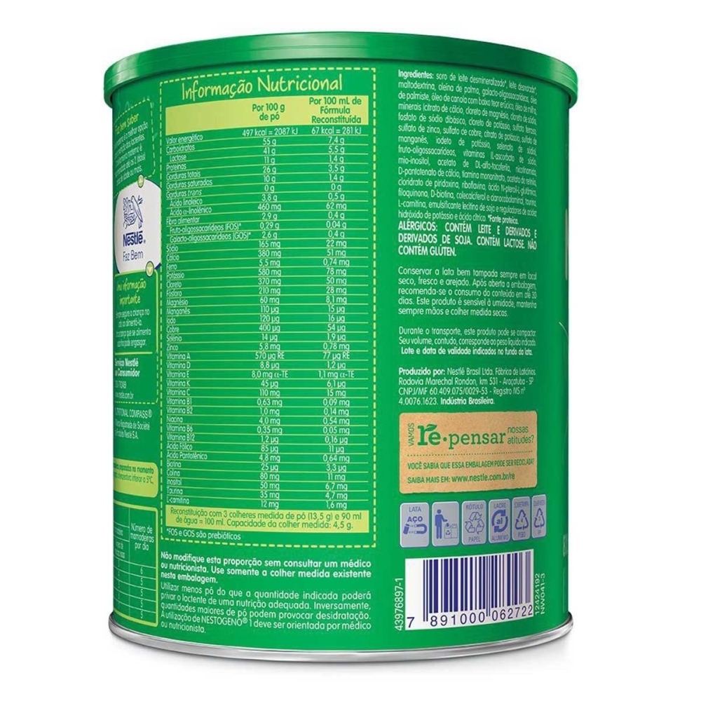 Rico em prebióticos (fundamentais para a manutenção microbiota do intestino, do sistema imune e do organismo como um todo), Nestogeno 1 também é fonte de proteínas, ferro, vitaminas e minerais.