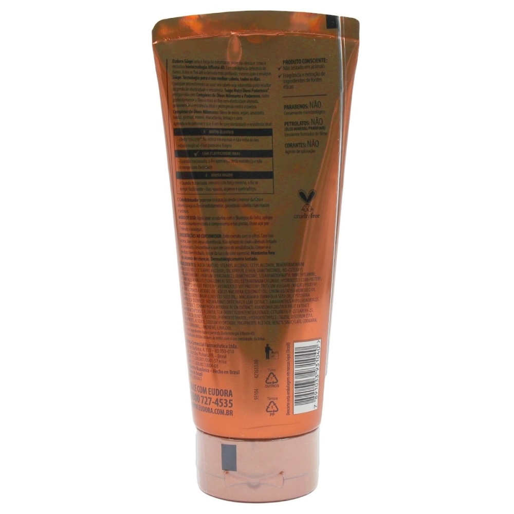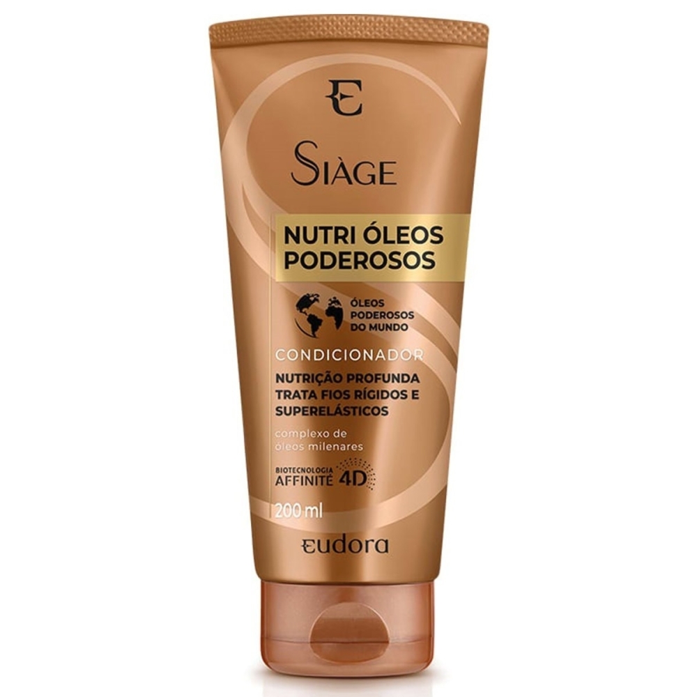 O Siàge Eudora Nutri Óleos Poderosos é um condicionador com alto poder condicionante que garante uma hidratação intensa até o interior da fibra dos seus fios, proporcionando cabelos resistentes já no primeiro dia de uso. Indicado para todos os tipos de cabelo, especialmente os secos, ressecados e quebradiços, o condicionador Siàge Nutri Óleos Poderosos da Eudora possui fórmula que conta com um inovador complexo de óleos capilares milenares poderosos que, além de nutrir profundamente e tratar os fios com elasticidade danificada, também os protege contra a quebra e promove a resistência ideal, sem pesar ou deixar os cabelos oleosos. Ainda, é um produto vegano, não testado em animais e que conta com a biotecnologia Affinité 4D, de origem vegetal, que detecta e trata de forma eficaz as áreas danificadas do cabelo. Após lavar os cabelos com o shampoo da linha, aplique o condicionador Siàge em todo o comprimento e nas pontas. Deixe agir por 1 minuto e enxágue.