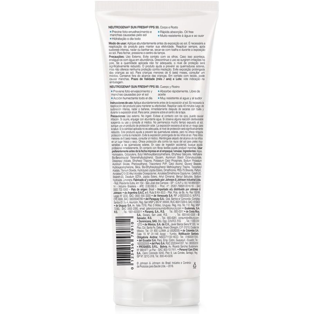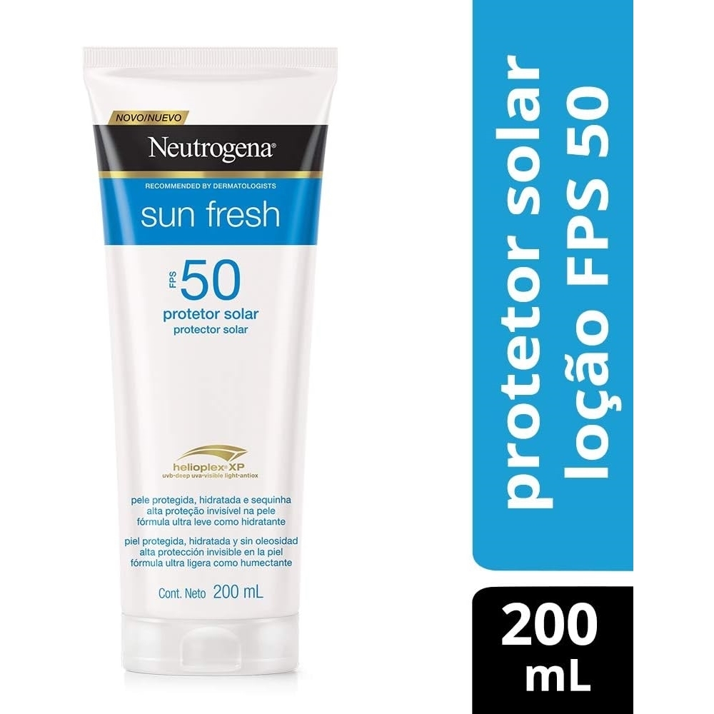O Protetor Solar Corporal Neutrogena Sun FreshFPS 50, 200ml de textura ultraleve, antioxidante, que deixa a pele hidratada, fresca e sequinha. É de rápida absorção, fácil de aplicar e possui tecnologia HELIOPLEX® que proporciona alta proteção contra os raios UVA e UVB, além de prevenir o envelhecimento e as manchas causadas pelo sol e ser muito resistente à água e ao suorBenefícios e diferenciaisFórmula com textura ainda mais leveNova tecnologia Helioplex XPProtege contra raios UVA, UVB e luz visívelAntioxidantePele protegida, hidratada e sequinhaInvisível na peleFórmula ultra leve como hidratanteMais agradável de usarOil FreeResistente à água e ao suorComo usarAplique abundantemente antes da exposição ao sol. É necessária a reaplicação do produto para manter sua efetividade. Reaplicar sempre, após sudorese intensa, nadar ou banhar-se, secar-se com toalha e durante a exposição ao sol. Para fechar, pressione o centro da tampa.