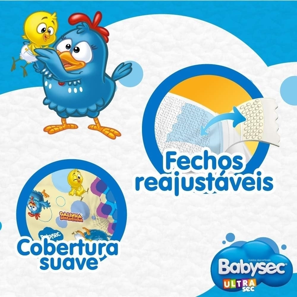 A fralda infantil Babysec UltraSec Galinha Pintadinha Até 12h de Proteção possui exclusiva tecnologia de ultra absorção e retenção, trazendo maior proteção, conforto e segurança para o bebê. Tem fácil ajuste com fechos reajustáveis, barreiras reforçadas antivazamentos e cobertura com toque suave e decorada com vários desenhos divertidos. As fraldas Babysec UltraSec da Galinha Pintadinha possuem exclusiva tecnologia de absorção e retenção, além de um conjunto de atributos que garantem a máxima proteção e conforto. Fácil ajuste com fechos reajustáveis, barreiras reforçadas e gel ultra-absorvente, tem alto desempenho com um ótimo custo benefício. As fraldas Babysec possuem cobertura com toque suave e decorada com vários desenhos divertidos.