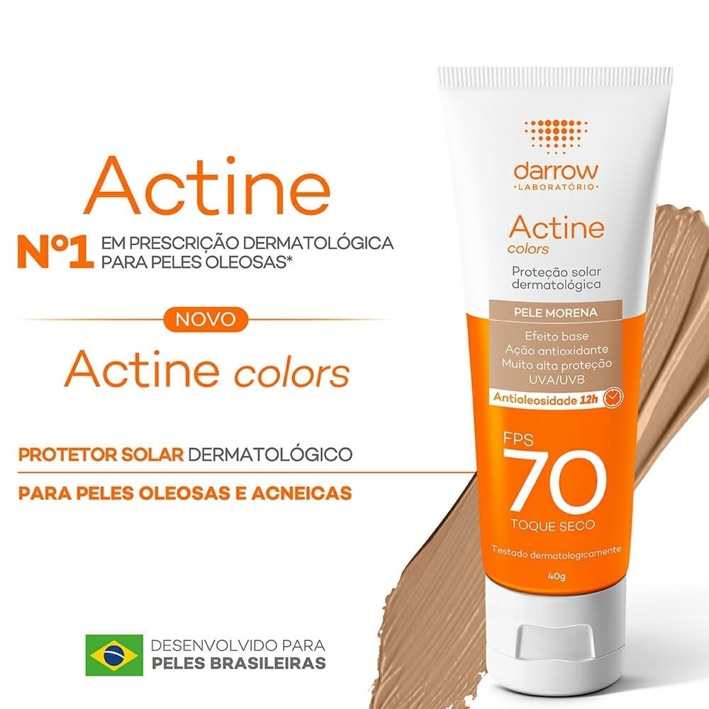 Actine Colors é um protetor solar facial desenvolvido especialmente para peles oleosas e acneicas. Possui muito alta proteção contra os raios UVB e UVA, luz visível e, por causa de sua ação antioxidante, também reduz os danos refletidos pelos raios infravermelhos. Previne manchas solares e o envelhecimento precoce da pele. Além da proteção contra os danos causados pela exposição solar, Actine Color possui cor, promovendo um efeito base e uniformizando o tom da pele de forma duradoura. Com textura fluida e de rápida absorção, ajuda a prevenir a acne com um potente controle de oleosidade por até 12 horas. Alta proteção UVA e UVB.Ideal para peles acneicas e oleosas. Com efeito base.Hipoalergênico.Não causa acne.Não é testado em animais.Livre de perfume e parabenos. Aplicar Actine Colors uniformemente na pele do rosto antes da exposição ao sol. Reaplicar sempre: após sudorese intensa, nadar ou banhar-se, secar-se com toalha e durante a exposição ao sol. Se a quantidade aplicada for insuficiente, o nível de proteção será significativamente reduzido.