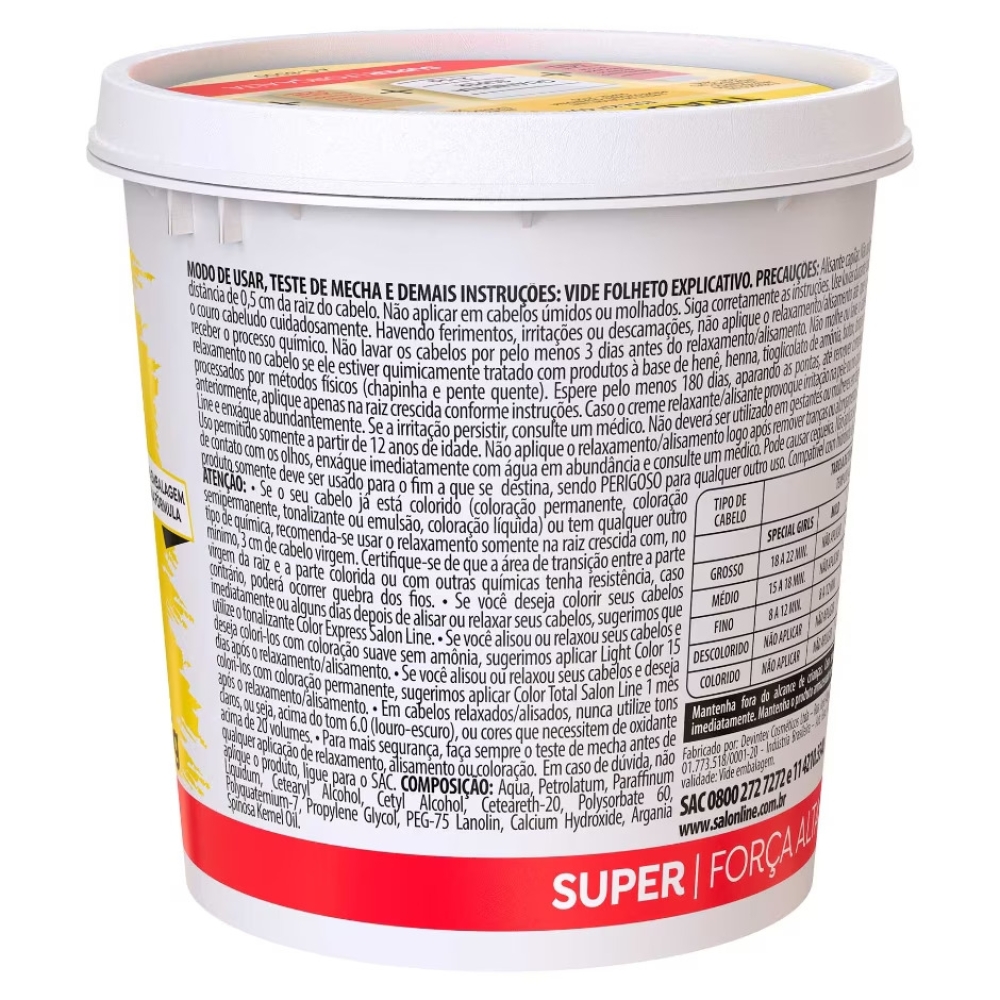 Quais os principais ativos?Fórmula enriquecida com Lanolina para cabelo, que promove emoliência, hidratação e umectação aos fios.As instruções de uso completas estão contidas no folheto explicativo que acompanha a Guanidina Salon Line. A UTILIZAÇÃO INCORRETA PODE DANIFICAR O CABELO.Antes de iniciar o processo, divida o cabelo a partir do meio da cabeça em 4 partes - duas atrás e duas na frente. Aplique Keratin Hair Food Salon Line no pescoço, orelhas, em volta do rosto, na linha do cabelo e no couro cabeludo para evitar possíveis reações. Em caso de retoque, aplique também no comprimento do cabelo. Coloque luvas. Siga as três etapas de aplicação a seguir e não pule nenhuma:1. Preparo da mistura: não utilize materiais metálicos. Utilize sempre materiais em plástico (pente e espátulas)2. Aplicação: comece o relaxamento pela parte de trás, mecha a mecha, aplicando generosamente com o auxílio de um pincel. Cubra todo o cabelo - e o mais rápido possível - para assegurar total cobertura de toda a cabeça. Após a aplicação do relaxamento, utilize a palma da mão para suavizar as áreas de aplicação, sempre manipulando no sentido dos fios e nunca ao contrário, pois esse esforço poderá parti-los. Aplique o relaxamento por área. Em cabelos virgens, enluve gentilmente com 0,5 cm de distância da raiz às pontas. Não puxe ou estique o cabelo. Para obter distribuição homogênea, enluve e manuseie levemente os cabelos com as mãos e use os últimos minutos do tempo de relaxamento para massagear o cabelo, verificando se alguma área ficou sem aplicação.3. Enxágue e neutralização: comece o enxágue pela parte de trás do cabelo, cuidadosamente, com água em abundância morna ou em temperatura ambiente. Aplique o Neutralizing Shampoo Salon Line. Ele é indispensável para a remoção total de resíduos.4. Condicionamento e finalização: depois que o relaxamento, a neutralização e o enxágue forem completados corretamente, aplique um Condicionador Salon Line de sua preferência. Distribua uniformemente a Guanidina por todo o cabelo e deixe agir por 5 minutos, enxágue e finalize como desejar.Lembre-se: o ideal é que se faça um tratamento diário com a linha Salon Line utilizando Shampoo, Máscara e Condicionador para que o cabelo fique ainda mais fortalecido.Atenção: Não aplique o relaxamento/alisamento logo após remover tranças ou alongamentos. Contém álcali. Se o seu cabelo já está colorido (coloração permanente, coloração semipermanente, tonalizante ou emulsão, coloração líquida) ou tem qualquer outro tipo de química, recomenda-se usar o relaxamento somente na raiz crescida com, no mínimo, 3 cm de cabelo virgem. Certifique-se de que a área de transição entre a parte virgem da raiz e a parte colorida ou com outras químicas tenha resistência, caso contrário, poderá ocorrer quebra dos fios.Dicas de usoUse luvas durante todo o processo de aplicação do relaxamento/amaciamento e não lave os cabelos por pelo menos 3 dias antes do procedimento.