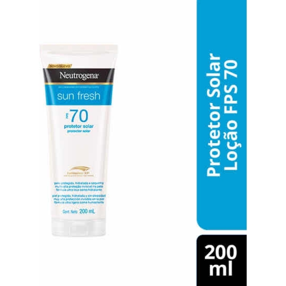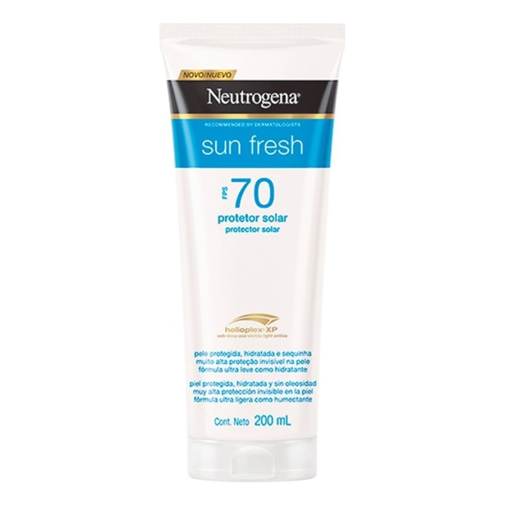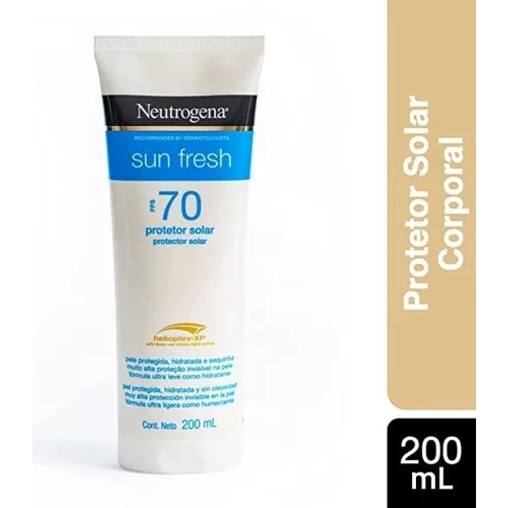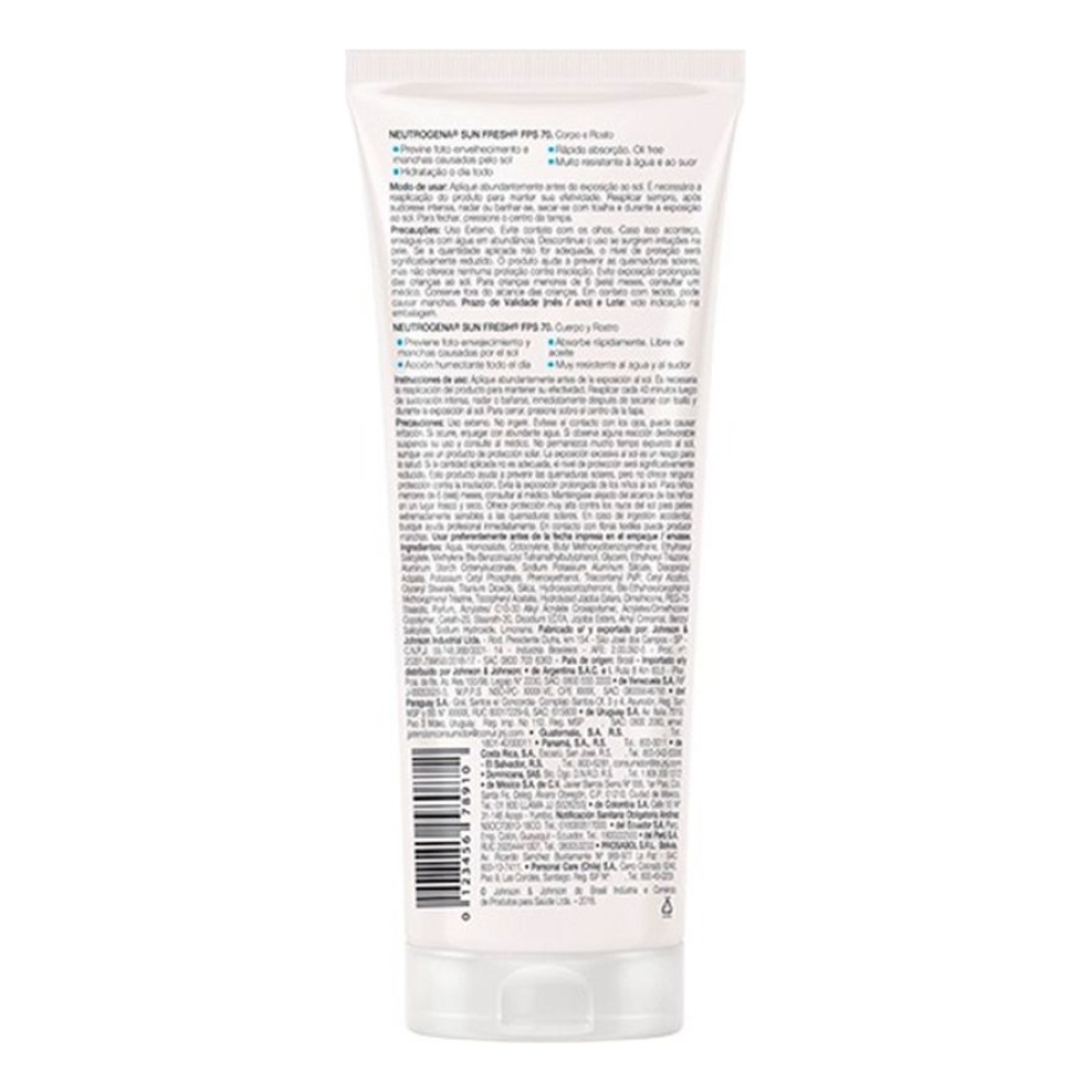 Neutrogena Sun Fresh FPS 70 é um protetor solar corporal com fórmula ultraleve que hidrata e protege a pele dos raios UVA/UVB. Indicado para todos os tipos de pele, inclusive as oleosas e as mais sensíveis, ajuda a prevenir o envelhecimento precoce e as manchas causadas pelo sol, mantendo a pele protegida, hidratada e sequinha. É altamente resistente à água e ao suor. Neutrogena Sun Fresh FPS 70 hidrata e protege a pele do corpo com sua tecnologia Helioplex® XP, que oferece alta proteção ampla e eficaz contra os raios UVB, UVA e luz visível. De absorção rápida e fórmula não oleosa, é ideal para utilizar antes da exposição ao sol e sempre que necessário.