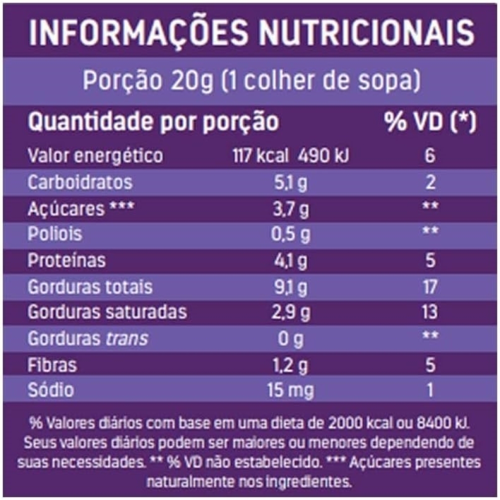 Sabor Avelã: Elegância em Cada Colherada Desfrute da sofisticação do Sabor Avelã da Dr. Peanut, onde cada colherada é uma experiência de sabor refinado e intensamente gratificante. Esta pasta de amendoim não é apenas um deleite para os sentidos, mas uma escolha saudável para quem aprecia o verdadeiro sabor da avelã misturado à cremosidade perfeita do amendoim. Feita com ingredientes selecionados, sem adição de açúcar, sem glúten e zero lactose, nossa Pasta de Avelã é ideal para quem busca um estilo de vida equilibrado sem abrir mão do prazer. Viva uma experiência única com a Pasta de Avelã Dr. Peanut, onde cada momento de consumo se transforma em uma celebração de sabor e estilo. Perfeita para ser saboreada sozinha, como recheio de doces ou até mesmo em pratos sofisticados que pedem um toque especial. Ingredientes: Amendoim torrado, creme sabor avelã (soro de leite, óleo vegetal, leite em pó, gordura vegetal, avelã, cacau em pó, lecitina de soja, edulcorante maltitol, emulsificante ésteres de poliglicerol de ácido ricinoléico e aromatizantes), whey protein sabor chocolate, sal e edulcorantes: xilitol, sucralose, acessulfame de potássio. ALÉRGICOS: CONTÉM AMENDOIM, AVELÃ, DERIVADOS DE LEITE E SOJA. PODE CONTER PISTACHE, CASTANHA DE CAJU E CASTANHA DO PARÁ. NÃO CONTÉM GLÚTEN. NÃO CONTÉM LACTOSE.