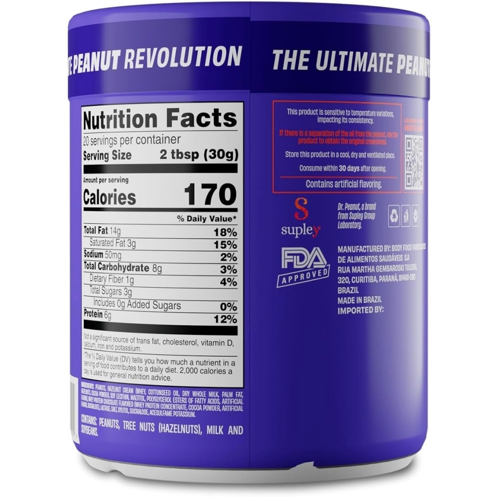 Sabor Avelã: Elegância em Cada Colherada Desfrute da sofisticação do Sabor Avelã da Dr. Peanut, onde cada colherada é uma experiência de sabor refinado e intensamente gratificante. Esta pasta de amendoim não é apenas um deleite para os sentidos, mas uma escolha saudável para quem aprecia o verdadeiro sabor da avelã misturado à cremosidade perfeita do amendoim. Feita com ingredientes selecionados, sem adição de açúcar, sem glúten e zero lactose, nossa Pasta de Avelã é ideal para quem busca um estilo de vida equilibrado sem abrir mão do prazer. Viva uma experiência única com a Pasta de Avelã Dr. Peanut, onde cada momento de consumo se transforma em uma celebração de sabor e estilo. Perfeita para ser saboreada sozinha, como recheio de doces ou até mesmo em pratos sofisticados que pedem um toque especial. Ingredientes: Amendoim torrado, creme sabor avelã (soro de leite, óleo vegetal, leite em pó, gordura vegetal, avelã, cacau em pó, lecitina de soja, edulcorante maltitol, emulsificante ésteres de poliglicerol de ácido ricinoléico e aromatizantes), whey protein sabor chocolate, sal e edulcorantes: xilitol, sucralose, acessulfame de potássio. ALÉRGICOS: CONTÉM AMENDOIM, AVELÃ, DERIVADOS DE LEITE E SOJA. PODE CONTER PISTACHE, CASTANHA DE CAJU E CASTANHA DO PARÁ. NÃO CONTÉM GLÚTEN. NÃO CONTÉM LACTOSE.