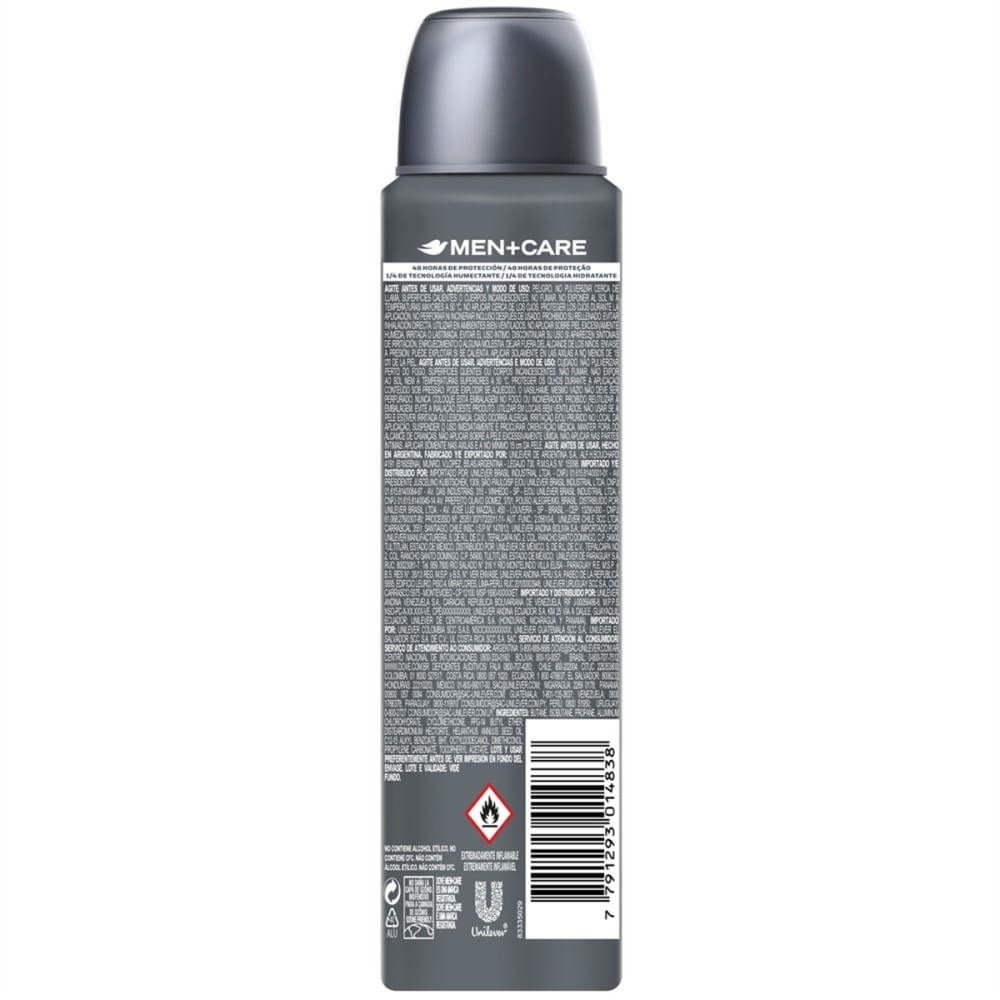 O que é e para que serve o Desodorante Antitranspirante Dove Men +Care Invisible Dry?Dove Men +Care Invisible Dry é o desodorante antitranspirante masculino feito para você que gosta de se sentir bem e confiante o dia todo. Oferece até 48h de proteção contra o suor e o mau cheiro, e foi testado em mais de 100 cores de roupas para garantir que as suas peças de vestuário permaneçam limpas e sem manchas.Fórmula livre de álcool etílico que não irrita a sua pele, além de exclusiva tecnologia com ¼ de creme hidratante, que mantém suas axilas livres de irritações. Em formato aerossol, com uma agradável aplicação seca.Benefícios e diferenciais48h de proteção contra o suor e o mau cheiro.Não mancha a roupa.Contém exclusiva tecnologia com ¼ de creme hidratante.Não irrita a pele.Sem álcool etílico.Testado em mais de 100 cores de roupas para garantir eficácia na aplicação, sem deixar resíduos.Formato aerossol com uma agradável aplicação seca.Como usar o Desodorante Antitranspirante Dove Men +Care Invisible Dry?Agite o frasco, segure-o a cerca de 15cm de distância de suas axilas (mais ou menos na altura do seu cotovelo) e aplique com um jato rápido. Recomenda-se aguardar as axilas ficarem totalmente secas antes de se vestir.IngredientesButane/Isobutane/Propane, Cyclomethicone, Ppg-14 Butyl Ether, Aluminium Chlorohydrate, Parfum, Disteardimonium Hectorite, Octyldodecanol, Helianthus Annuus Seed Oil, Bht, Propylene Carbonate, Dimethiconol, Tocopheryl Acetate, Alpha-Isomethyl Ionone, Benzyl Alcohol, Benzyl Salicylate, Butylphenyl Methylpropional, Cinnamyl Alcohol, Citronellol, Coumarin, Geraniol, Hexyl Cinnamal, Hydroxycitronellal, Hydroxyisohexyl 3-Cyclohexene Carboxaldehyde, Linalool.*Os ingredientes podem ser atualizados ou alterados. Sempre verifique a embalagem do produto.AdvertênciaUsar somente nas axilas.Não usar se a pele estiver irritada ou lesionada.Caso ocorra irritação e/ou prurido no local da aplicação, suspender o uso imediatamente e procurar orientação médica.Evite a inalação deste produto.Proteja os olhos durante a aplicação.Perigo: Aerossol extremamente inflamável.Recipiente sob pressão: risco de explosão sob a ação do calor.Mantenha afastado do calor, superfícies quentes, faísca, chama aberta e outras fontes de ignição. Não fumar. Não pulverizar perto do fogo ou outra fonte de combustão.Não perfurar, nem incinerar, nem queimar, mesmo após utilização.Não expor ao sol, nem a temperaturas superiores a 50ºC.Somente a embalagem vazia pode ser reciclada.Caso haja contato com os olhos, lave-os abundantemente.Conserve em local seco, fresco e ao abrigo de luz intensa.Mantenha fora do alcance das crianças.