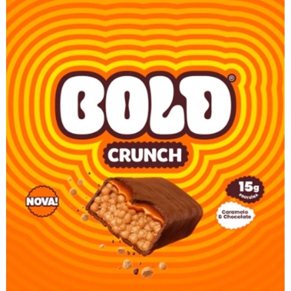 Chegou a Bold Crunch, uma barrinha de proteína crocante com sabores deliciosos e que fornece 15g de proteína por unidade! Uma forma prática e muito gostosa de consumir mais proteína e ainda matar aquela vontade de comer um docinho. Feita com crispies proteicos de proteína isolada de soja. As barras da Bold possuem sabores incríveis, essa é um lançamento: Caramelo e Chocolate, que combina recheio de caramelo diet com cobertura de chocolate ao leite diet e os crispies crocantes. Tudo isso sem adição de açúcar! Benefícios do consumo de barrinhas de proteína:. Você pode levar e consumir em qualquer lugar;. Fornece 15g de proteína;. Pode ser utilizado como pré ou pós treino;. 0g de açúcar adicionado;. Um lanche proteico com praticidade.