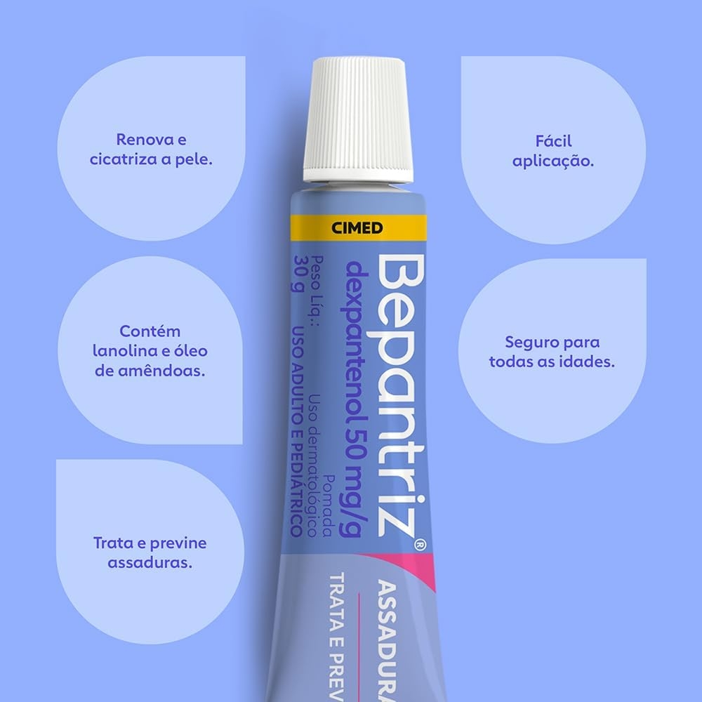 Bepantriz pomada oferece dupla proteção para a pele, especialmente contra assaduras. Contém como princípio ativo o dexpantenol, que está incorporado em uma base oleosa, a lanolina. O dexpantenol ajuda a proteger a pele agindo por dentro: penetra as camadas internas da pele e é transformado em vitamina B5, que estimula a formação e regeneração natural da pele. A lanolina protege por fora: forma uma barreira na pele, protegendo-a das agressões externas, como urina, fezes e ressecamento.