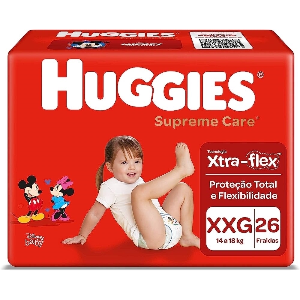 26 unidades de fraldas Huggies Supreme Care tamanho XXG (14 a 18kg), com Tecnologia Xtra-Flex.