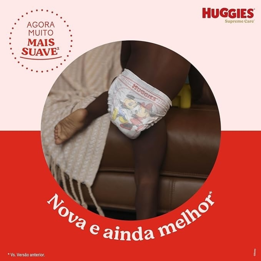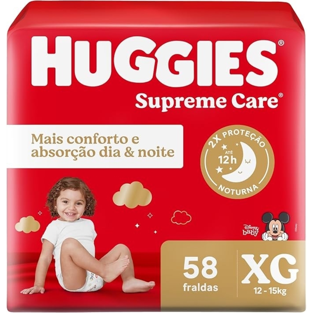 A Supreme Care é a companhia perfeita para você que busca máxima proteção enquanto seu bebê se movimenta. Com uma suavidade mais macia do que nunca, especialmente na parte traseira, proporciona conforto e absorção ideais, mantendo seu bebê sempre sequinho. Graças à sua tecnologia exclusiva, a Supreme Care é a única com canais em formato de X, adaptando-se para oferecer mais liberdade de movimento, com uma anatomia que se adapta aos movimentos do seu bebê. Com ajustes elásticos na cintura, barreiras e orelhas elásticas para máxima flexibilidade e conforto, oferece duas vezes mais proteção noturna comparada às fraldas Huggies sem a tecnologia Xtra-Flex. Além disso, sua cintura com indicadores alerta o momento ideal para trocar de tamanho, proporcionando tecnologia superior com mais conforto e absorção tanto durante o dia quanto à noite, em comparação com fraldas tradicionais Huggies.