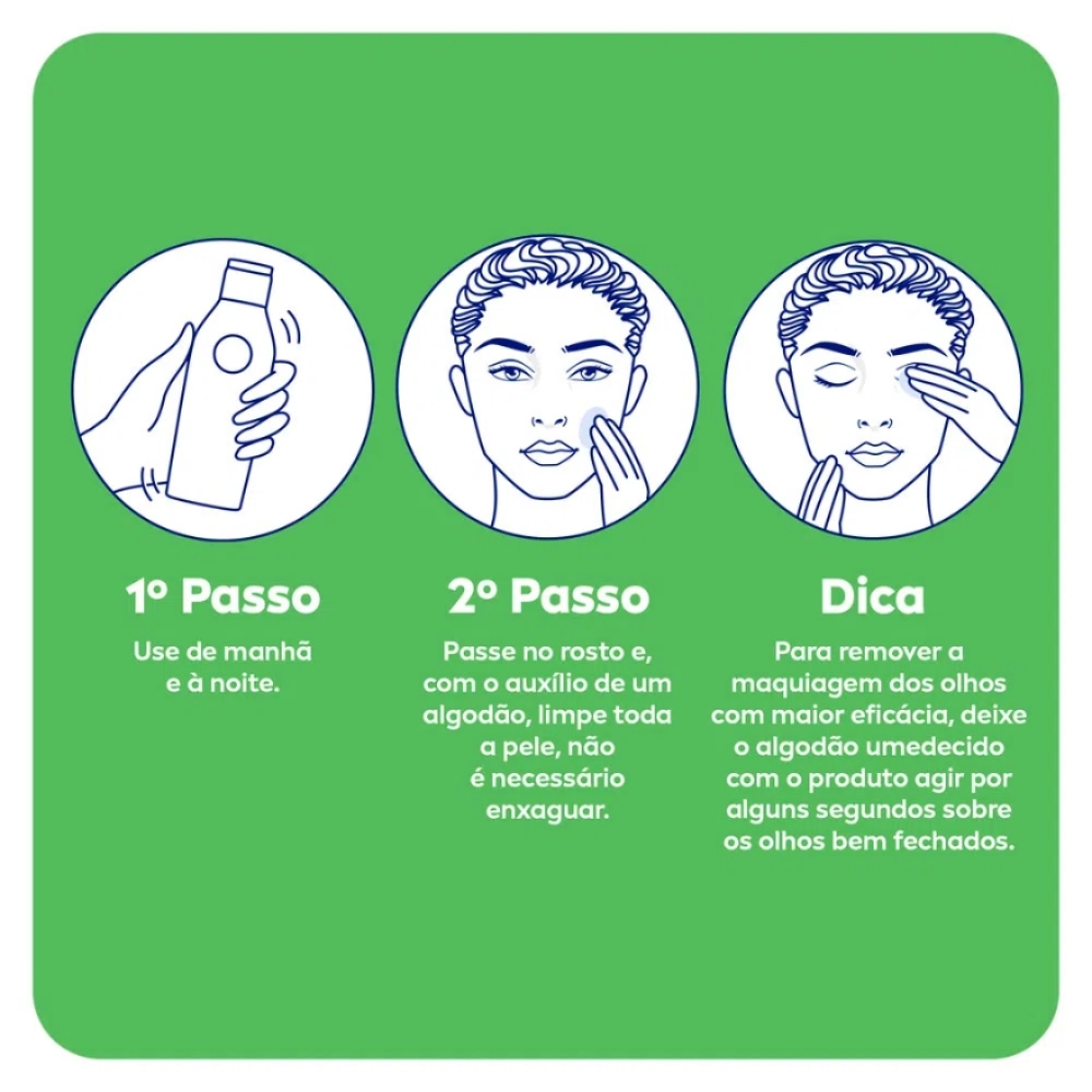 Use pela manhã e à noite com o auxílio de um algodão, limpando todo o rosto. Para remover a maquiagem dos olhos com maior eficácia, deixe o algodão umedecido com o produto agir por alguns segundos sobre os olhos bem fechados. Não é necessário enxaguar.